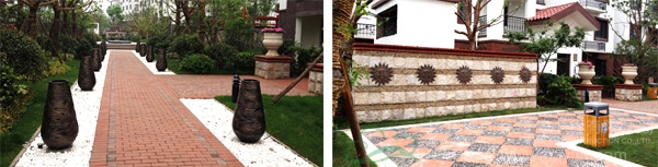 據(jù)楊經(jīng)理介紹,紫金東郡小區(qū)里的鋪裝材料主要以橙紅色的燒結(jié)磚和仿古磚為主,燒結(jié)磚具有承重量大和隔聲性強的特點,是小區(qū)園路鋪裝的優(yōu)良選擇,此外,紅色又與建筑的整體色調(diào)相搭配,有種渾然一體的效果感;而仿古磚除了具有防水、防滑、耐磨等特性外,還具有獨特的古典韻味,更能營造出歲月的滄桑和厚重感。在鋪裝方式上,有的是道路中間用橙紅色的燒結(jié)磚,兩邊鋪設(shè)白色的石子,營造一種居家庭院的溫馨感;有的是正方形的仿古磚與黑色的石子,一紅一黑,相映成趣;還有的用白色的仿古磚作道路兩側(cè)的點綴,風(fēng)格自成一體。純美的色彩、流暢的線條、些微的暖調(diào),不同的道路上別具特色的圖案,使人走上去踏實、安穩(wěn)而又感古樸、雅致,成為不斷蜿蜒的腳下風(fēng)景。