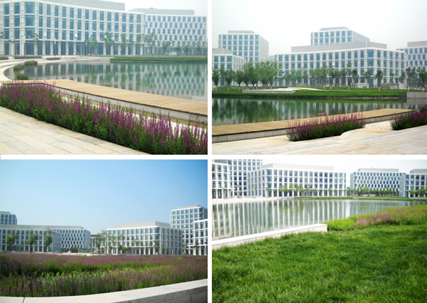 本工程是大型商務(wù)園配套景觀綠化工程,整個(gè)項(xiàng)目以人工湖為中心將建筑呈環(huán)形布置,分為內(nèi)環(huán)、中環(huán)、外環(huán)。綠化圍繞建筑均勻有層次的分布,環(huán)路兩側(cè)栽植國(guó)槐;辦公樓之間則種植日本晚櫻、碧桃、海棠等觀花、觀葉類喬木,以及黃楊、女貞等灌木和綠籬;中心湖區(qū)域兩側(cè)的能源半島和濕地半島上被喜水性植物覆蓋,起到凈化湖水的作用,岸邊種植垂柳,開辟休閑區(qū)域;園路鋪裝材料選用水洗石、花崗巖,石汀、鋪裝與綠地自然銜接;再加上花壇和景觀小品,各種觀賞性植物互相襯托,喬木與灌木合理搭配,使得景觀與建筑、環(huán)境完美結(jié)合。